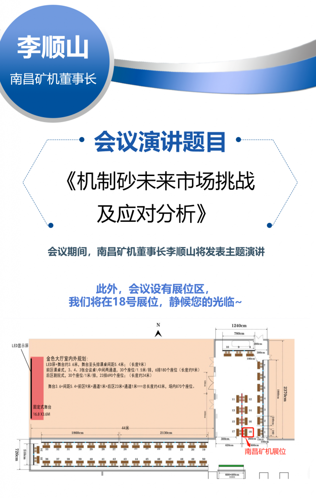 南昌礦機董事長李順山將出席會議,發(fā)表以《機制砂未來市場挑戰(zhàn)及應對分析》為題的主題演講。會議設立集中展示區(qū),南昌礦機將在18號展位進行企業(yè)展示,靜候您的光臨。