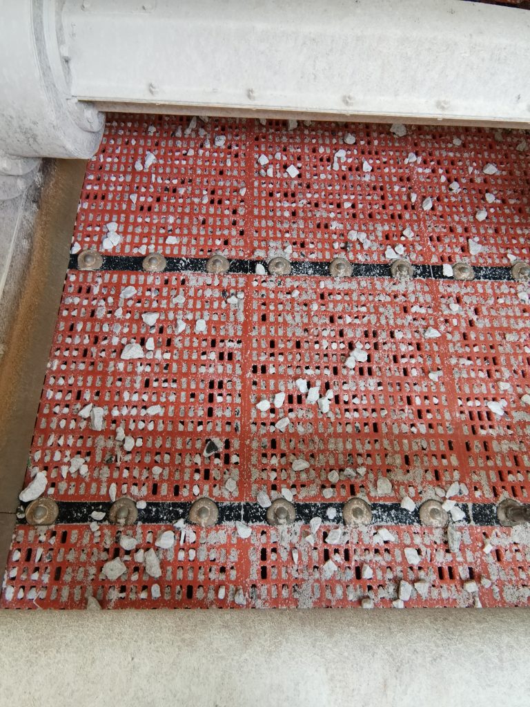 ? ? 無奈之下,宜春鉭鈮礦的工作人員準備使用某國外著名品牌的橡膠篩網(wǎng),但更換成本高、改造時間長等因素讓他們一直猶豫。在猶豫之時,南昌鑫力的技術人員為他們帶來了滿意的解決方案,即不改變原篩網(wǎng)結構型式,將原來14x30mm的孔改為12x30mm,將普通聚氨酯篩網(wǎng)更換為南昌鑫力生產(chǎn)的MDI雙硬度防堵篩網(wǎng)。該方案得到了江鎢集團領導和宜春鉭鈮礦領導的認可,雙方于2020年3月簽訂了合同,4月26日篩網(wǎng)安裝完成并投入使用。