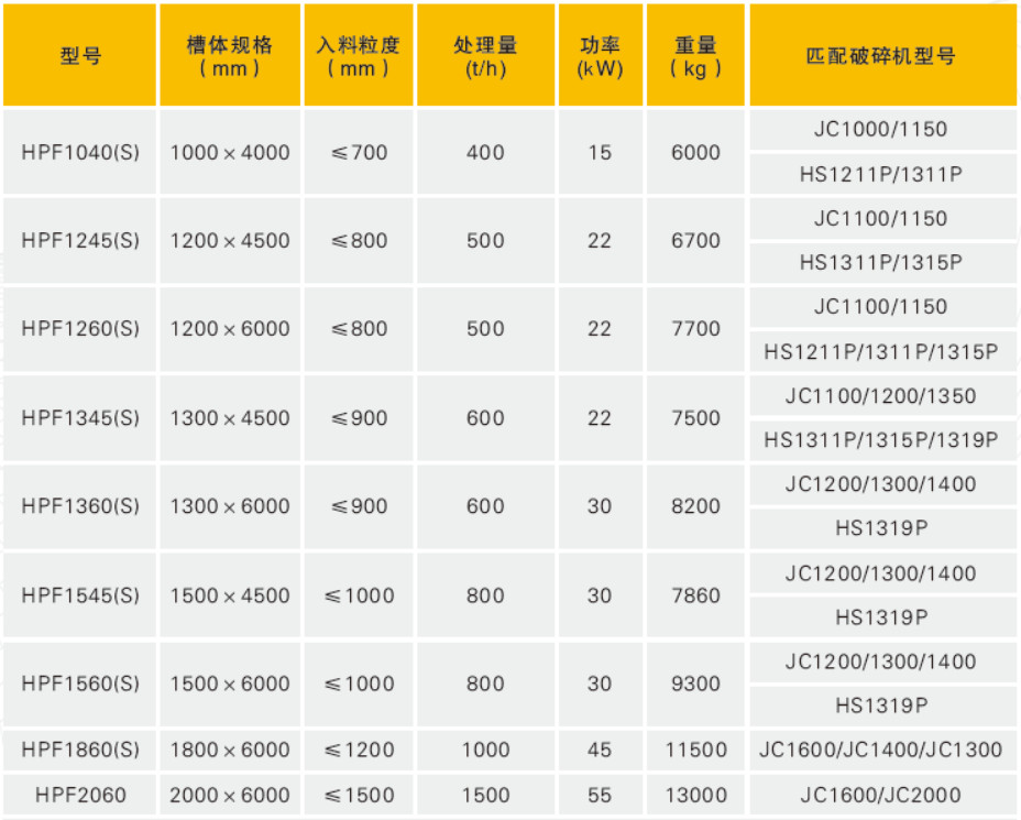 HPF重型振動(dòng)給料機(jī),適用于向初級(jí)顎式破碎機(jī)、初級(jí)反擊破碎機(jī)和初級(jí)錘式破碎機(jī)等進(jìn)行給料,廣泛應(yīng)用于石料、建材和冶金礦山行業(yè)。HPF型給料機(jī)高度較低, 布置空間小, 其最大處理量達(dá)1500TPH,最大給料粒度達(dá)1.5m,標(biāo)準(zhǔn)給料斗容量25~45m ;